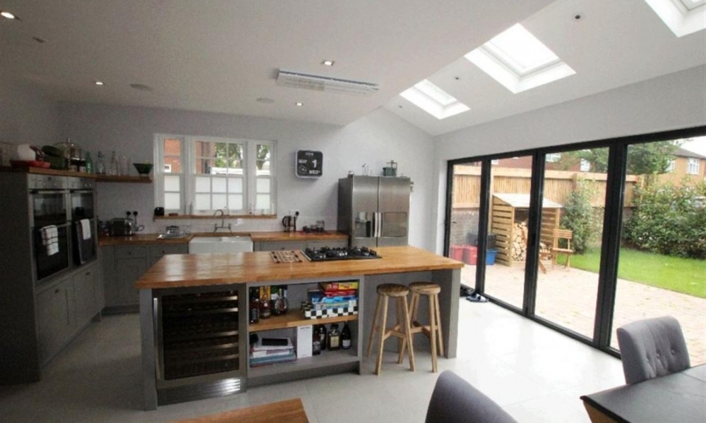 On the ground floor, the open-plan design now combines the lounge, dining, and kitchen into one spacious area at the rear. A lean-to roof with rooflights, along with bi-fold doors opening onto the garden, brings in plenty of natural light. The front room retains its feature bay window, giving the entire ground-floor living space a bright, dual-aspect feel.